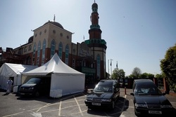 While the mosque in the central England city has been closed in response to the coronavirus pandemic, its parking lot has been transformed into a temporary morgue with room for 150 bodies.