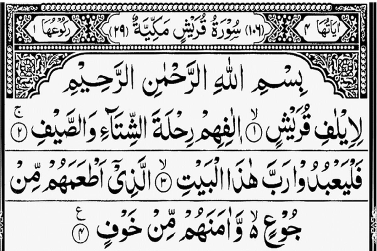 Al-Quraysh is the 106th chapter of the Quran that has 4 verses and is in the 30th Juz. It is Makki and the 29th Surah revealed to the Holy Prophet (PBUH).