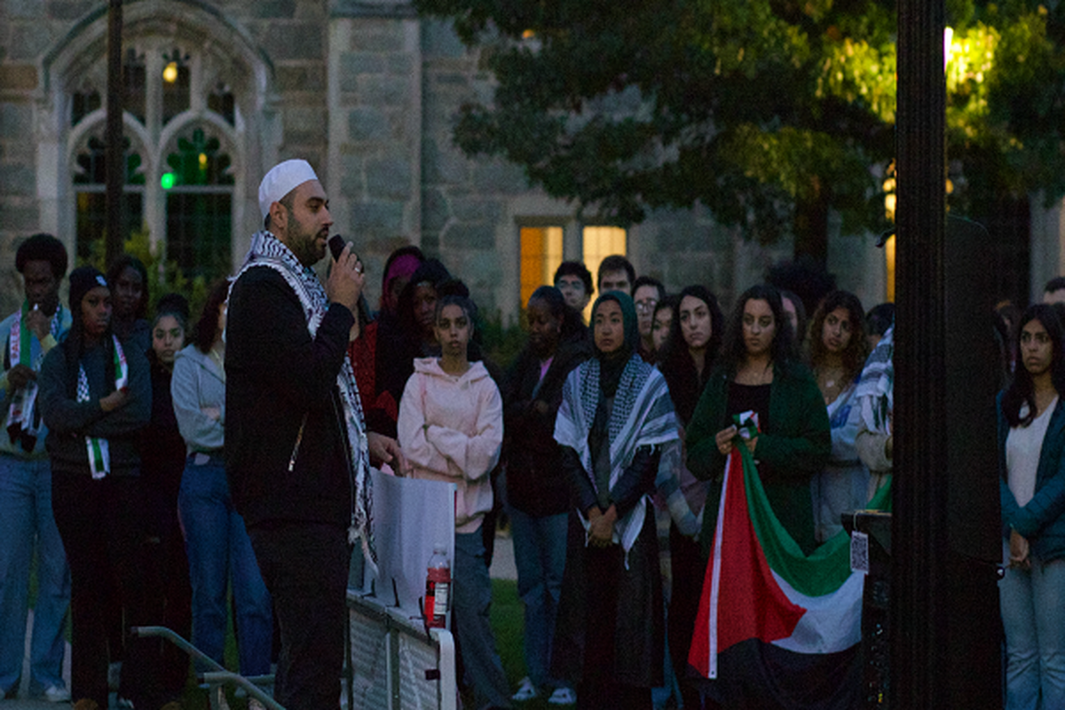 Mahmoud El-Rifai asked a crowd of Boston College students, faculty, and student groups to reflect on the rising numbers of deaths in Gaza during the “Prayer for Palestine” event on Thursday night.