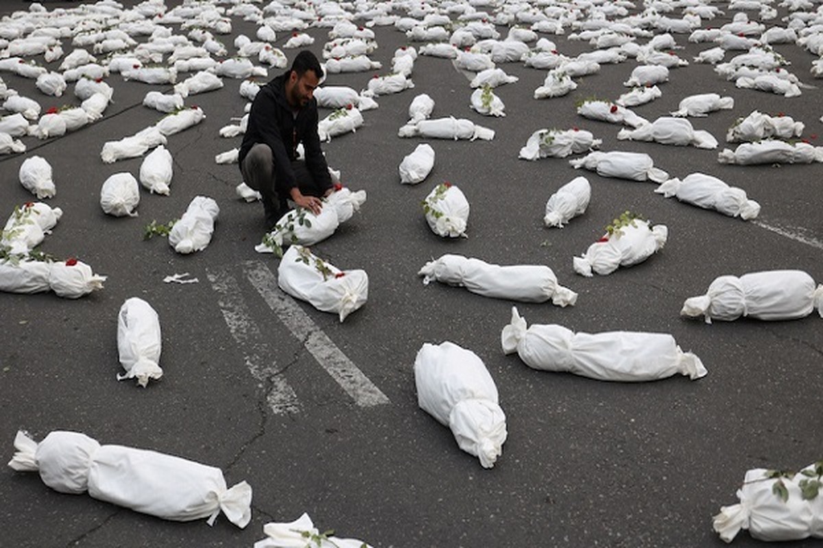 It took place in front of the Neue Wache, the city's central monument. Hundreds of pairs of children's shoes were placed on the sidewalk of Unter den Linden Street to draw attention to the mass killings in the Gaza Strip.