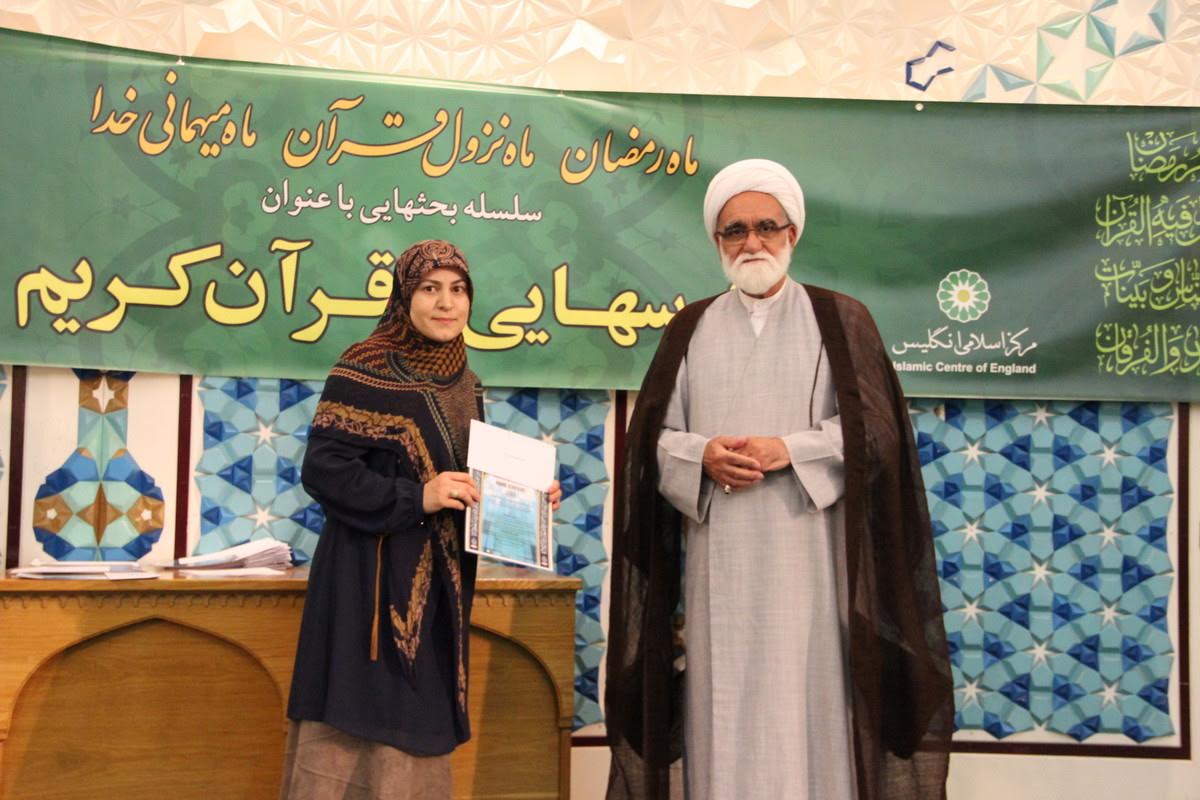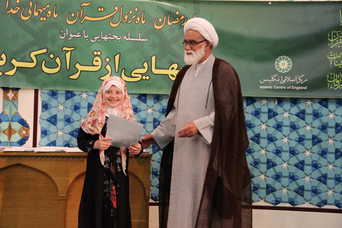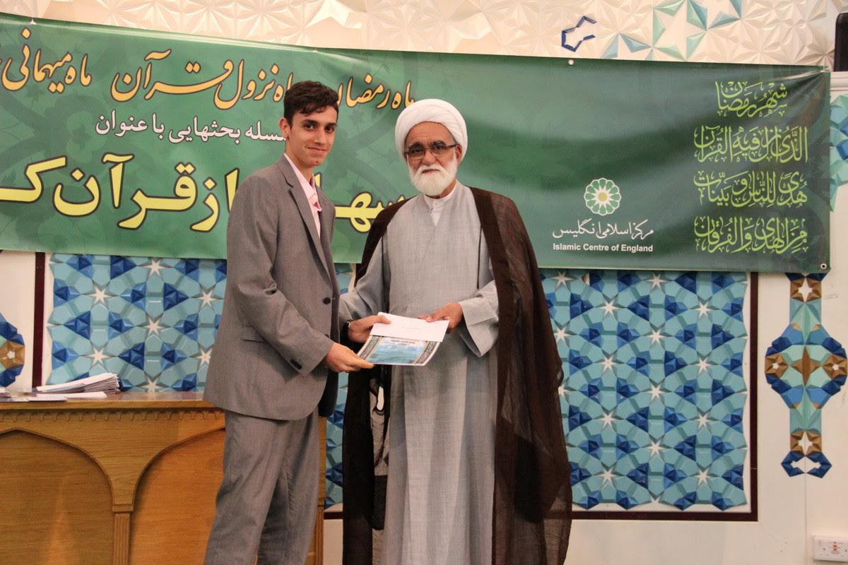 این گزارش حاکی است در آخرین بخش این مراسم، به برندگان دختر و پسر ردههای اول تا سوم رشتههای مختلف مسابقات جوایز و لوحهای تقدیر توسط حجتالاسلام والمسلمین معزی از سوی مرکز اسلامی انگلیس اهدا شد.