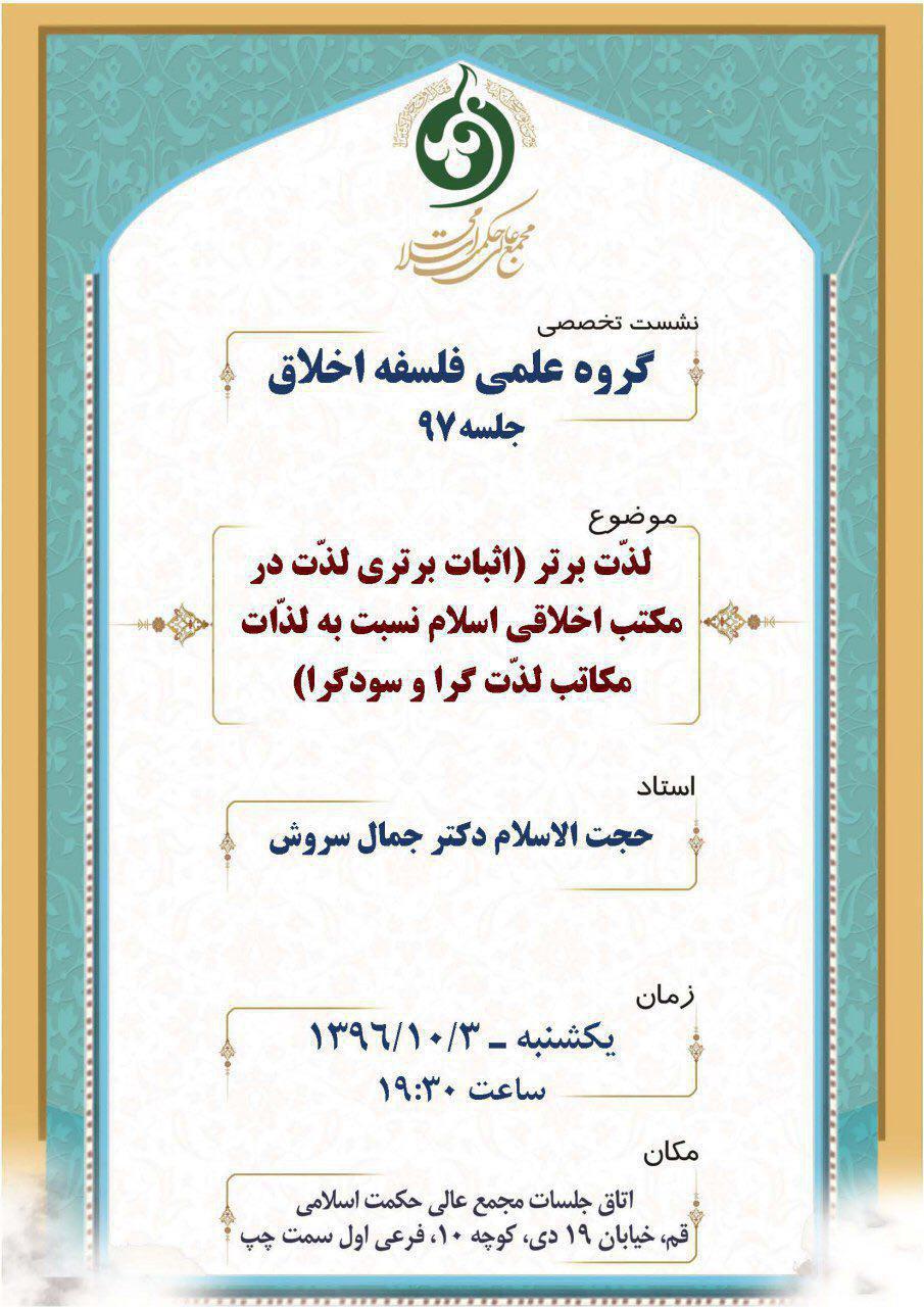 این نشست در روز یکشنبه، ۳ دی ۹۶ از ساعت ۱۹:۳۰ در مجمع عالی حکمت اسلامی برگزار میشود.