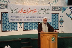 پس از خیر مقدم و اعلام برنامه توسط حجت الاسلام شیخ جعفر علی نجم و تلاوت آیاتی از قرآن توسط سید جلال معصومی، اولین سخنران این جلسه، حجت الاسلام و سید فاضل میلانی، امام مرکز اسلامی خویی لندن بود که با اشاره به خطبه پیامبر اکرم (ص) درباره ماه مبارک رمضان، مهمترین هدف و رسالت در این ماه را تعلیم و تربیت و تبلیغ معارف اسلامی توسط روحانیون و علما در منابر وعظ دانست.