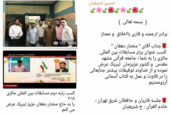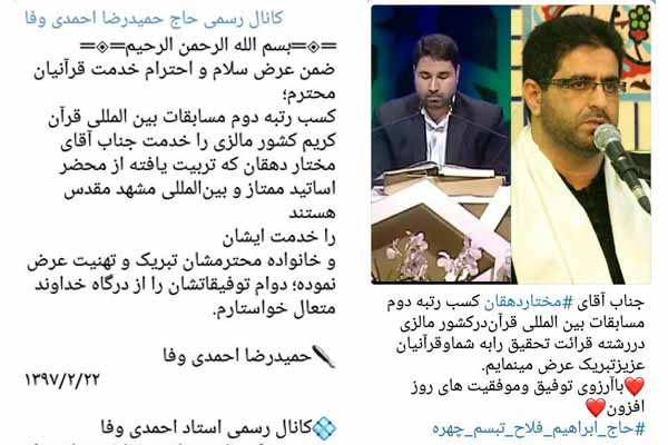 به گزارش ایکنا؛ در پی کسب رتبه دوم توسط مختار دهقان در مسابقات بینالمللی قرآن مالزی، قاریان ممتاز و بینالمللی کسب این عنوان را در فضای مجازی به دهقان تبریک گفتند.