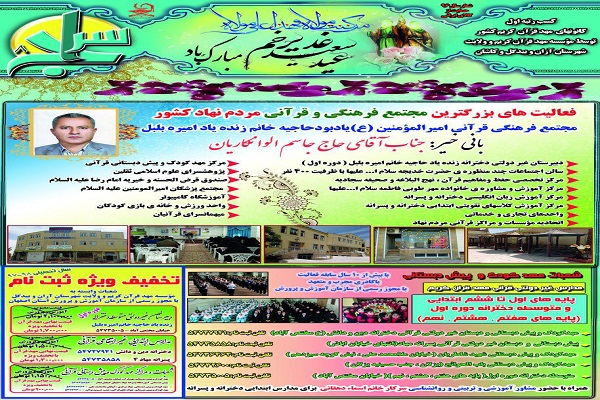 در این ویژهنامه درباره فعالیتهای بزرگترین مجمع فرهنگی و قرآنی مردمنهاد کشور به نام مجمع فرهنگی امیرالمومنین(ع) مطالبی به قلم آمده است و همچنین اطلاعرسانی مهد و پیش دبستانی این مرکز، فعالیتهای واحد تخصصی بانوان و آقایان بزرگسال، مهد قرآن کریم و ولایت در یک نگاه، صندوق قرض الحسنه امام رضا(ع)، برنامههای غدیر و غیره نیز در این نشریه منتشر شد.