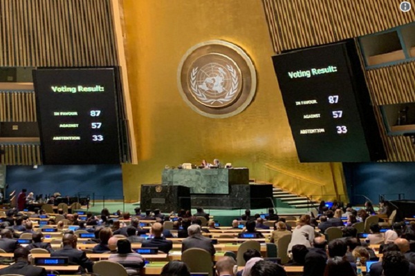 به گزارش ایکنا به نقل از عصر ایران؛ قطعنامه پیشنهادی ایالات متحده آمریکا که حمایت اسراییل را نیز به همراه داشت با رای مثبت 87 کشور و رای منفی 57 کشور و رای ممتنع 33 کشور عضو سازمان ملل در مجمع عمومی تصویب نشد. این قطعنامه برای تصویب نیازمند کسب دو سوم آرای اعضای مجمع عمومی سازمان ملل بود.