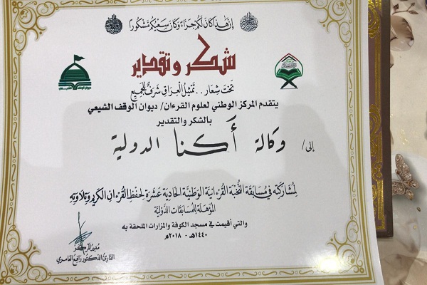 به گزارش ایکنا از عراق؛ رافع العامری، مدیر مرکز ملی علوم قرآن وابسته به اداره اوقاف شیعیان عراق با اعطای تقدیرنامهای از خبرگزاری ایکنا به دلیل پوشش فعالیتهای این مرکز از جمله یازدهمین دوره مسابقات بینالمللی حفظ و تلاوت قرآن نخبگان عراق و رونمایی از مصحف شریف دستنویس اثر خوشنویسان عراقی، تقدیر کرد.