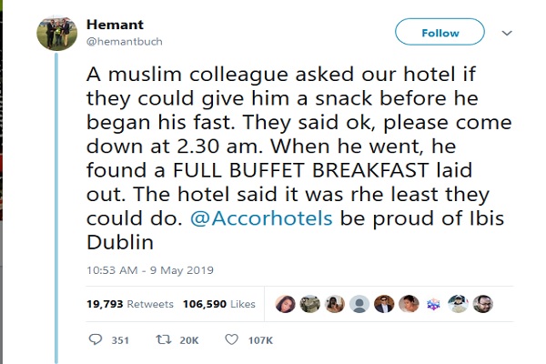 به گفته «همانت بوخ»، کارکنان این هتل در ساعت 2 و 30 دقیقه نیمه شب وعده سحری برای همکار مسلمان او آماده کردند.