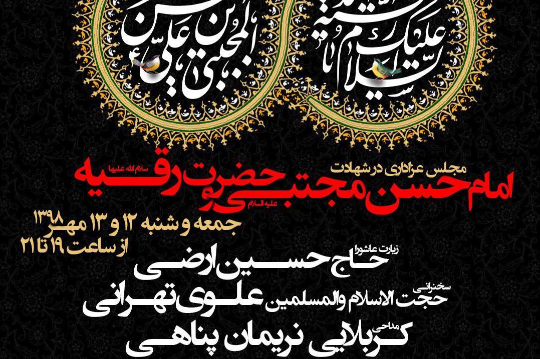 گروه اندیشه ــ مراسم سوگواری به مناسبت شهادت امام حسن مجتبی(ع) و شهادت حضرت رقیه(س) با سخنرانی حجت‌الاسلام علوی تهرانی برگزار می‌شود.