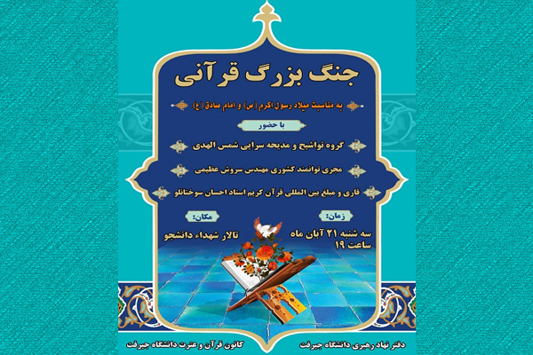 نبأ؛ به مناسبت گرامیداشت سالروز میلاد رسول اکرم(ص) و امام صادق(ع) ویژهبرنامه قرآنی با همکاری مؤسسه سروش جاودانه وحی مشهد، دفتر نهاد رهبری در دانشگاه جیرفت و کانون قرآن و عترت دانشگاه جیرفت برگزار میشود.