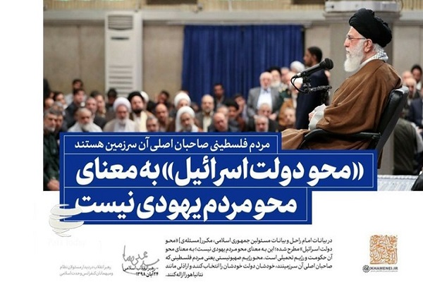 اما جمهوری اسلامی با اتکاء به عقلانیت، منطق و همچنین تجربیات تاریخی و سیاسی، راهحل و راهکار روشنی برای حل مسئله دارد. راهحلی دمکراتیک که مبتنی بر خواست، اراده و رأی مردمِ حقیقی فلسطین است: «راه حلِّ منطقی راهحلی است که همه وجدانهای بیدار دنیا و همه کسانی که به مفاهیم امروزِ دنیا معتقدند، ناچارند آن را قبول کنند... راه حلّ نظرخواهی از خودِ مردم فلسطین؛ همه کسانی که از فلسطین آواره شدهاند؛ البته آنهایی که مایلند به سرزمین فلسطین و به خانه خودشان برگردند. این یک امر منطقی است. این کسانی که در لبنان و در اردن و در کویت و در مصر و در بقیه کشورهای عربی سرگردانند، به کشور و به خانه خودشان فلسطین برگردند - آنهایی که مایلند؛ نمیگوییم کسی را به زور بیاورند - و از کسانی که قبل از سال ۱۹۴۸ که سال تشکیل دولت جعلی اسرائیل است، در فلسطین بودهاند - چه مسلمانشان، چه مسیحیشان، چه یهودیشان - نظرخواهی شود. اینها در یک نظرخواهی عمومی، رژیم حاکم بر سرزمین فلسطین را تعیین کنند. این دمکراسی است. چطور برای همه دنیا دمکراسی خوب است، برای مردم فلسطین دموکراسی خوب نیست؟!... مردم فلسطین جمع شوند، رأی بدهند و نوع رژیمی را که در این کشور باید حاکم باشد، انتخاب کنند. آن رژیم و آن دولت، تشکیل شود و درباره کسانی که بعد از سال ۱۹۴۸ به سرزمین فلسطین آمدهاند، تصمیمگیری کند؛ هر چه تصمیم گرفت. اگر تصمیم گرفت بمانند، پس بمانند، اگر هم تصمیم گرفت بروند، پس بروند. این، هم آراءِ مردم است، هم دمکراسی است، هم حقوق بشر است، هم منطبق با منطق فعلی دنیاست.» ۱۳۸۱/۰۱/۱۶ و «این همان نابود شدن و از بین رفتن رژیم باطل و جعلی صهیونیستی است که امروز بر سر کار است.» ۱۳۹۷/۰۳/۲۵
