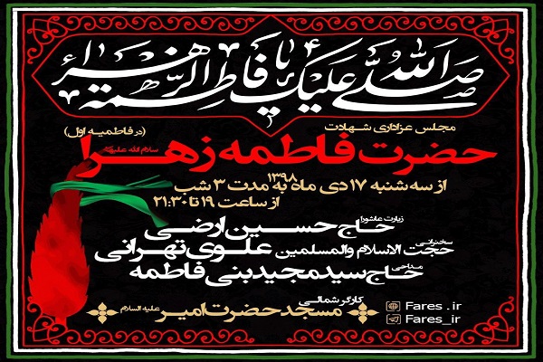 ایکنا؛ مراسم عزاداری شهادت حضرت زهرا(س) در دهه اول فاطمیه، از سهشنبه، 17 دی، به مدت سه شب و از ساعت 19 تا 21:30 واقع در خیابان کارگر شمالی، مسجد حضرت امیر(ع) برگزار میشود.