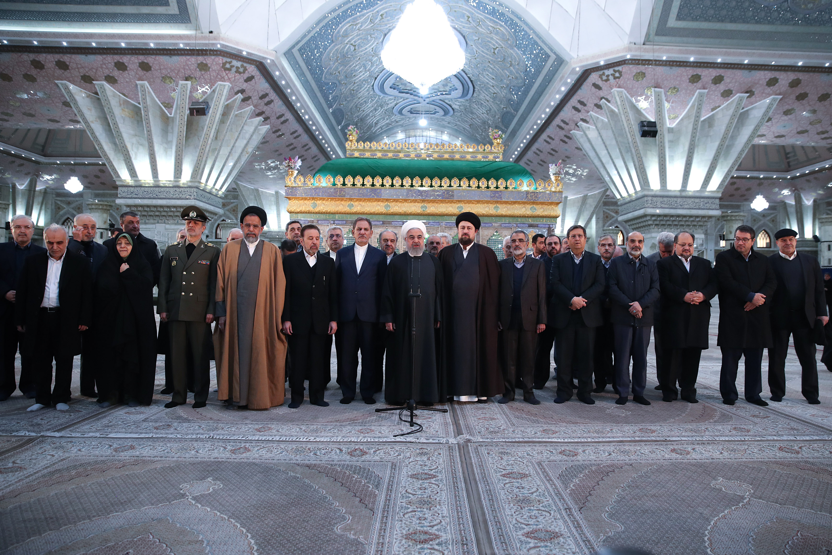 دولت جمهوری اسلامی ایران باز هم در کنار مرقد امام(ره) بزرگوار تعهد میکند که همه توان خود را برای اجرای فرامین و راه امام(ره)، با هدایتهای مقام معظم رهبری ادامه دهد. مردم ما به خوبی در این روزها نشان دادهاند که انقلاب و امام(ره) زنده است. آن روزی که برای یک شاگرد مکتب امام(ره) یعنی شهید سردار سلیمانی همه به خیابانها آمدند و به استقبال جنازه او آمدند و بدن او را بدرقه کردند، نشان دادند که راه امام(ره) زنده است، مسیر امام(ره) پررهرو است، آن اسلامیت در میان مردم حضور دارد و آن جمهوریت حضور دارد و وقتی مردم کسی را به عنوان نشانه امنیت و عزت کشور بدانند همه در کنار او هستند و او را به عنوان سمبل ملی میدانند، امام(ره) مکتبش و راهش امروز هم برای ما راهگشاست.