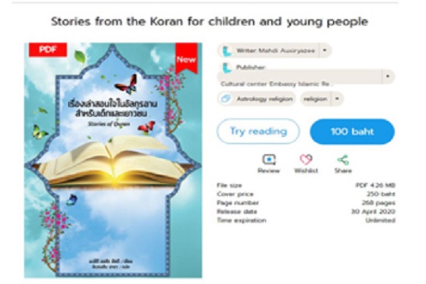 وی در ادامه افزود: کتاب داستانهای قرآن از سری کتابهای «قصههای خوب، برای بچههای خوب» تألیف مهدی آذریزدی با ترجمه شیخ ابراهیم آوه به زبان تایلندی در سال 1397 در شمارگان 1000 نسخه با حمایت مرکز ترجمه و نشر معارف اسلامی و علوم انسانی و در قالب طرح تاپ به همت رایزنی فرهنگی سفارت جمهوری اسلامی ایران در بانکوک منتشر شده است.