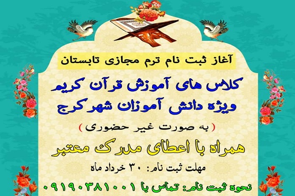 به گزارش ایکنا، علاقهمندان برای ثبت نام در سطوح مختلف ترم تابستان دارالقرآن شهید علیزاده کرج میتوانند مشخصات خود را تا پایان خردادماه جاری به صورت پیامکی به شماره 09190381001 ارسال کنند.