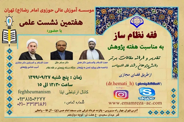 به گزارش ایکنا، به مناسبت هفته پژوهش، هفتمین نشست علمی موسسه آموزش عالی حوزوی امام رضا(ع) پنجشنبه، 27 آذرماه جاریاز ساعت ۱۳:۳۰ در فضای مجازی اسکایپ و اینستاگرام، با حضور اساتید حوزه و دانشگاه برگزار میشود.