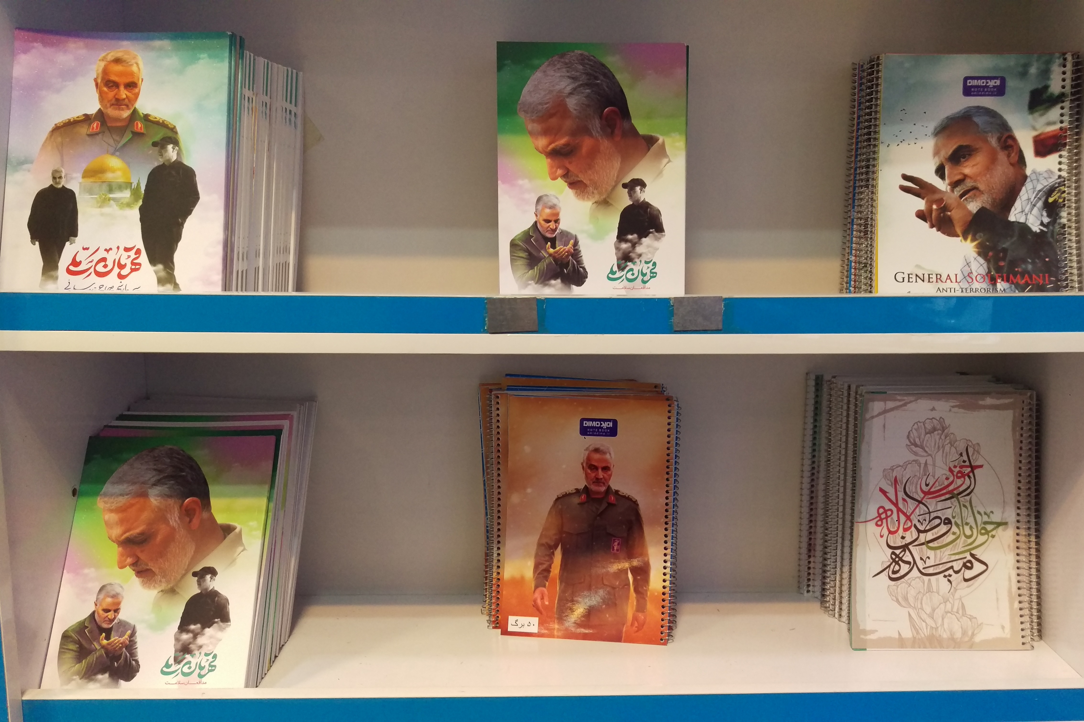 البته این نمایشگاه، نمایشگاه و فروشگاه دائمی نوشتافزار ایرانی ـ اسلامی است که فقط بخشی از آن به آثار مرتبط با سردار سلیمانی اختصاص یافته است. در این نمایشگاه کولهپشتیها و دفترهایی را با مضامین مرتبط با کرونا مشاهده میکنید که در آنها تصاویر جالب بچهها با ماسک چاپ شده که سپر و شمشیری دارند و در حال جنگیدن با ویروس کرونا هستند، یا پزشکی که مانند سوپرمن دست خود را مشت کرده و در حال پرواز است.