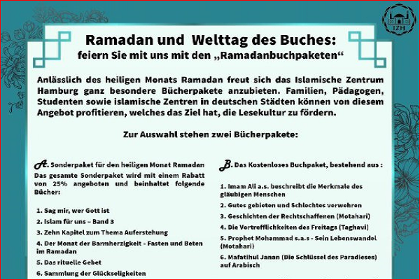 به گزارش ایکنا، این مرکز اعلام کرد: طرح رایگان و تخفیفی کتب اسلامی با هدف تشویق خانوادهها، مربیان، دانشجویان و مراکز اسلامی شهرهای مختلف آلمان به مطالعه و فرهنگ کتابخوانی اجرا شده است و شامل ارائه دو بسته کتاب به زبان آلمانی است.