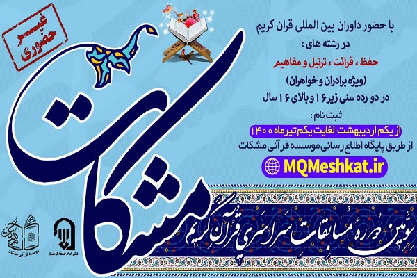 به گزارش ایکنا، ثبتنام سومین دوره مسابقات قرآن کریم مشکات، امسال بهصورت سراسری و غیر حضوری آغاز و تا اول تیرماه سال جاری ادامه دارد.