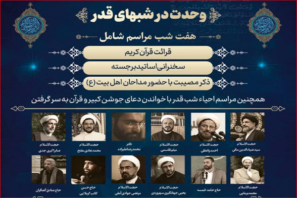 حجتالاسلام سیدضیاء الدین مکی، رئیس مرکز اسلامی فرانسه و حجتالاسلام محمدهادی مفتح، رئیس مرکز اسلامی هامبورگ در برنامه «وحدت در شبهای قدر» سخنرانی خواهند کرد و این برنامه شب گذشته با سخنرانی حجتالاسلام صابر اکبری جدی، رئیس مرکز اسلامی مسکو و مداحی حاج صادق آهنگران همراه بود.