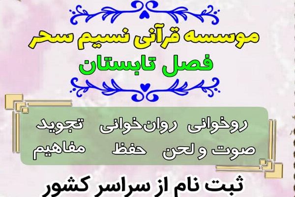 به گزارش ایکنا، دورههای روخوانی، روانخوانی، تجوید، صوت و لحن، حفظ و مفاهیم از سوی مؤسسه قرآنی نسیم سحر برگزار میشود.
