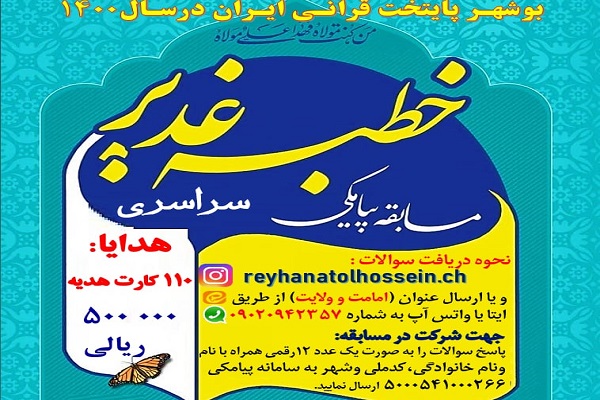 به گزارش ایکنا، مسابقه پیامکی خطبه غدیر با محوریت خطبه پیامبر اکرم(ص) در عید غدیر از سوی مؤسسه فرهنگی ـ مردمی قرآن و عترت ریحانة‌الحسین(ع) چغادک با همکاری اتحادیه مؤسسات و تشکل‌های قرآن و عترت بوشهر، سازمان تبلیغات اسلامی استان، بنیاد بین‌المللی غدیر استان، اداره‌کل اوقاف و امور خیریه استان و مؤسسه قرآنی حضرت رقیه(س) بوشهر برگزار می‌شود.