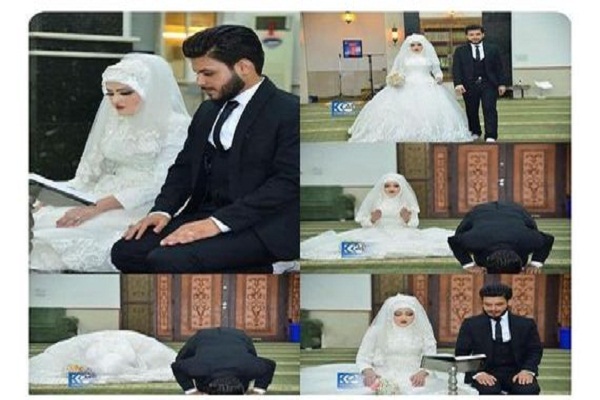 این دو عروس و داماد به همراه جمعی از اعضای خانواده و نزدیکان خود به مسجدی در شهر اربیل رفتند و در آنجا به اقامه نماز و قرائت قرآن مشغول شده و سپس ازدواج رسمی خود را از آنجا اعلام کردند.