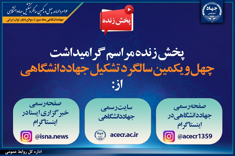 این مراسم به صورت زنده از ساعت ۱۱ روز یکشنبه ۱۷ مردادماه از سایت جهاددانشگاهی به نشانی www.acecr.ac.ir و صفحات رسمی این نهاد در اینستاگرام به نشانی http://instagram.com/acecr1359 و خبرگزاری ایسنا https://instagram.com/isna.news پخش خواهد شد.