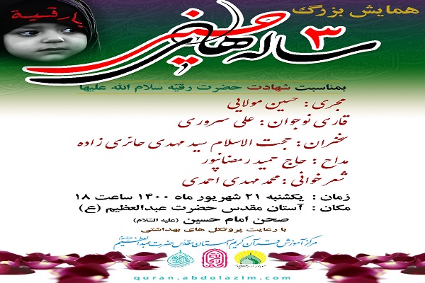 به گزارش خبرنگار افتخاری ایکنا، همایش «سه سالههای حسینی(ع)» به همت مرکز آموزش قرآن کریم آستان مقدس حضرت عبدالعظیم(ع) بهمناسبت گرامیداشت سالروز شهادت حضرت رقیه(س) مصادف با پنجم ماه صفر، از ساعت ۱۸ در صحن امام حسین(ع) آستان مقدس حضرت عبدالعظیم(ع) ویژه نونهالان قرآنی برگزار میشود.