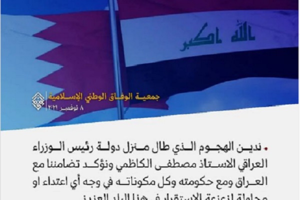 در بیانیه جمعیت الوفاق آمده است: ما حملهای که منزل مصطفی الکاظمی، نخستوزیر عراق را هدف قرار داد، محکوم میکنیم و بر همبستگی خود با عراق، دولت و تمامی اجزای آن در برابر هرگونه تجاوز یا تلاش برای بیثبات کردن این کشور عزیز تأکید میکنیم.
