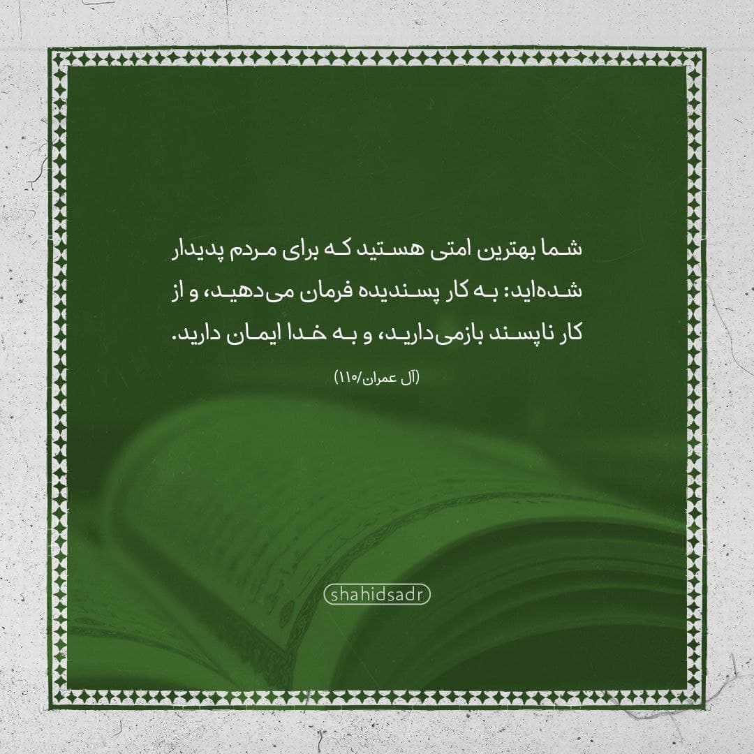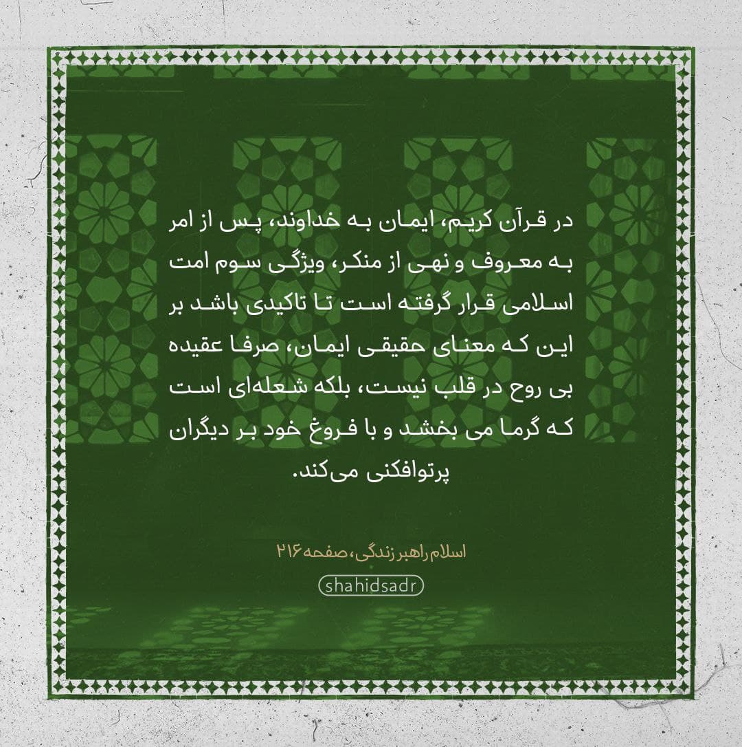 كنْتُمْ خَيْرَ أُمَّةٍ أُخْرِجَتْ لِلنَّاسِ تَأْمُرُونَ بِالْمَعْرُوفِ وَتَنْهَوْنَ عَنِ الْمُنْكَرِ وَتُؤْمِنُونَ بِاللَّهِ ۗ ؛ شما بهترين امتى هستيد كه براى مردم پديدار شدهايد: به كار پسنديده فرمان مىدهيد، و از كار ناپسند بازمىداريد، و به خدا ايمان داريد. (آل عمران/۱۱۰) در قرآن کریم، ایمان به خداوند، پس از امر به معروف و نهی از منکر، ویژگی سوم امت اسلامی قرار گرفته است تا تأکیدی باشد بر این که معنای حقیقی ایمان، صرفا عقیده بیروح در قلب نیست، بلکه شعلهای است که گرما میبخشد و با فروغ خود بر دیگران پرتوافکنی میکند. [آیتالله شهید صدر، کتاب اسلام راهبر زندگی، صفحه ۲۱۶]