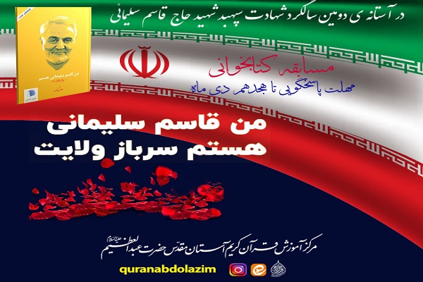 به گزارش خبرنگار افتخاری ایکنا، مسابقه کتابخوانی بهمناسبت دومین سالگرد شهید سپهبد قاسم سلیمانی از کتاب «من قاسم سلیمانی هستم سرباز ولایت» نوشته ناصر کاوه از سوی مرکز آموزش قرآن کریم آستان مقدس حضرت عبدالعظیم الحسنی(ع) در حال برگزاری است.