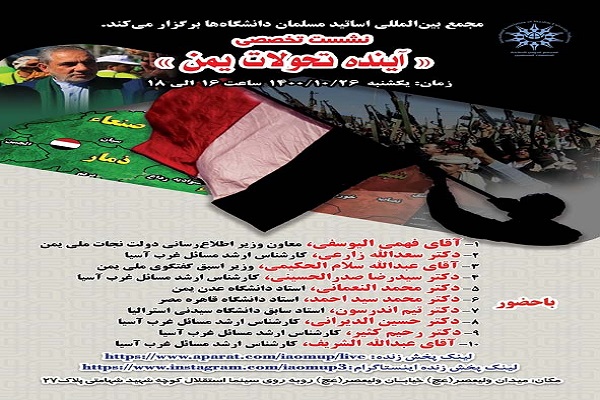 به گزارش ایکنا به نقل از روابط عمومی مجمع بینالمللی اساتید مسلمان دانشگاهها، نشست تخصصی «آینده تحولات یمن» با حضور تنی چند استادان برجسته دانشگاه و شماری از شخصیتهای سیاسی 26 دی ماه برگزار میشود.