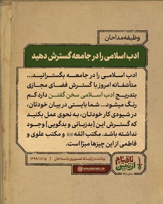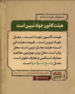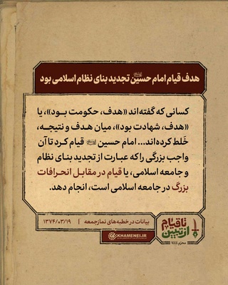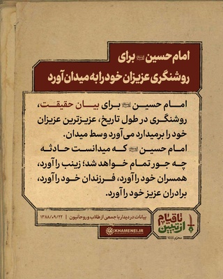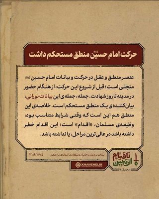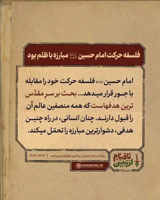 امام حسین (ع) فلسفه حرکت خود را مقابله با جور قرار می‌دهد... بحث بر سر مقدس‌ترین هدف‌هاست که همه منصفین عالم آن را قبول دارند. چنان انسانی، در راه چنین هدفی، دشوارترین مبارزه را تحمل می‌کند. [رهبر معظم انقلاب؛ ۱۳۷۳/۳/۱۷]به مناسبت فرا رسیدن عاشورای حسینی مجموعه فتوتیتر «از تبیین تا قیام» ارائه می‌شود.