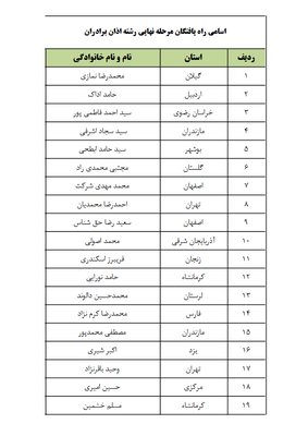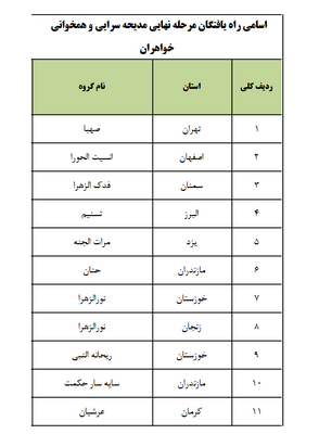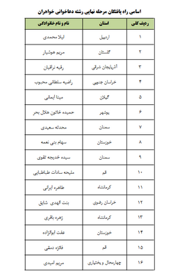 بر همین اساس در رشته دعاخوانی بانوان 17 نفر، رشته دعاخوانی آقایان 22 نفر، رشته مدیحهسرایی و همخوانی قرآن کریم بانوان 11 گروه، رشته مدیحهسرایی و همخوانی قرآن کریم آقایان 18 گروه و رشته اذان که ویژه آقایان است نیز 19 نفر به مرحله نهایی مسابقات سراسری راه یافتهاند.