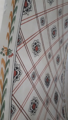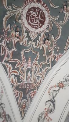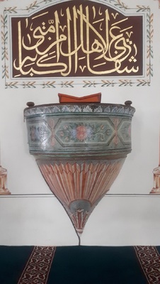 تزیینات دیواری شگفتانگیز داخل مسجد با تزئینات گیاهی غنی پر شده است؛ شاخهها، گلها و گلدستهها که بین مدالهایی با نقل قولهایی از قرآن قرار گرفتهاند. نقاشیهای دیواری احتمالاً مربوط به اواخر قرن هفدهم و آغاز قرن نوزدهم است.