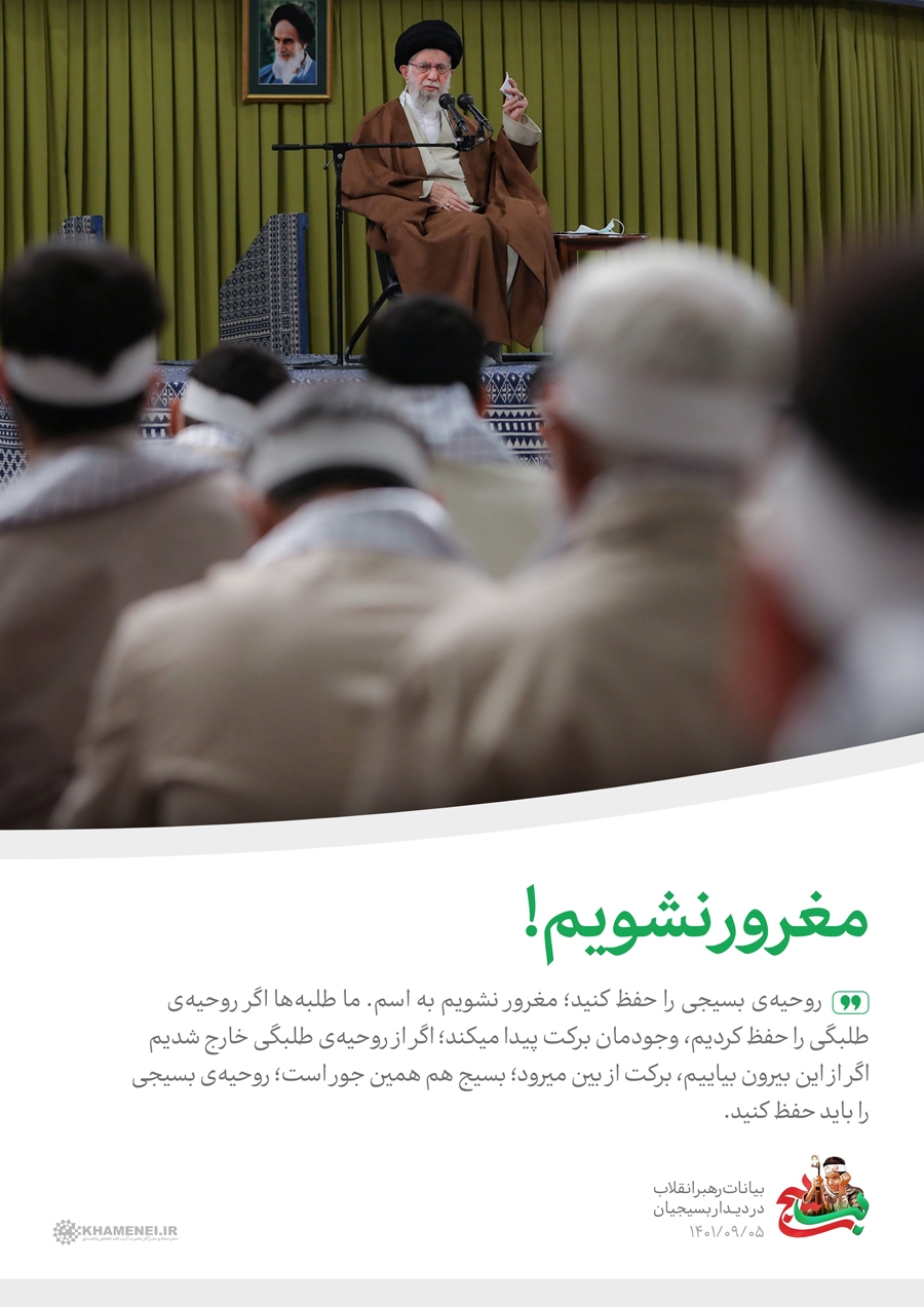 رهبر انقلاب در جمع کثیری از بسیجیان در حسینیه امام خمینی(ره) عنوان کردند: روحیه بسیجی را حفظ کنید و مغرور نشویم. در ادامه گزیدههایی از بیانات رهبر را در این دیدار تقدیم مخاطبان گرامی ایکنا می شود.