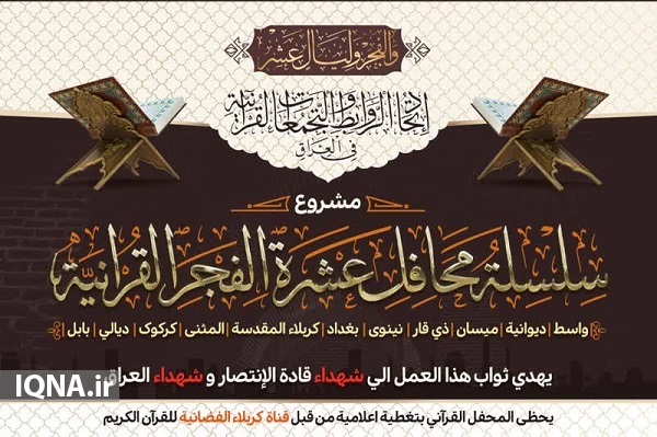 به گزارش ایکنا، ١١٠ محفل انس با قرآن در ١١ استان عراق بهمناسبت سومین سالگرد شهادت سردار دلها شهید حاج قاسم سلیمانی و شهید ابومهدی المهندس، با عنوان «دهه فجر قرآنی» به مدت ١٠ شب از ۵ تا ١٤ دی ماه در استانهای بغداد، کربلا، دیوانیه، دیالی، بابل، واسط، المثنى، ذیقار، کرکوک، العماره و موصل برگزار میشود.