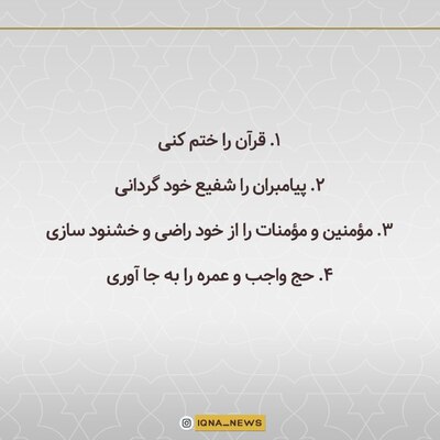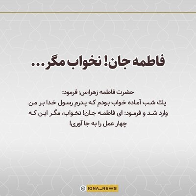حضرت فاطمه زهرا(س) فرمود: يك شب آماده خواب بودم كه پدرم رسول خدا بر من وارد شد و فرمود: اي فاطمه جان! نخواب، مگر اين كه چهار عمل را به جا آوري ...