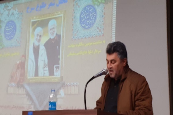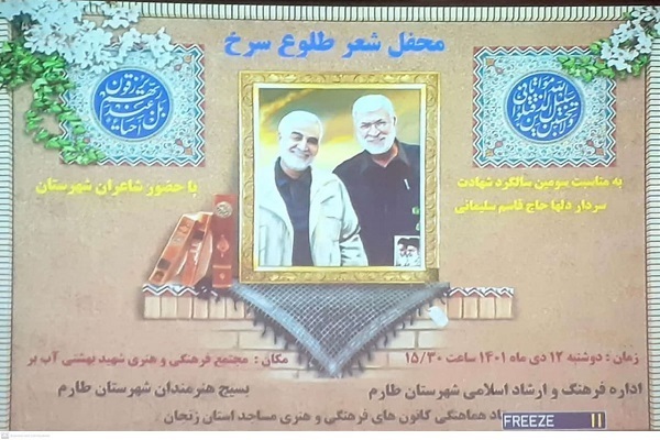 به گزارش خبرنگار افتخاری ایکنا، بهمناسب گرامیداشت سومین سالگرد شهادت سردار قاسم سلیمانی و شهدای مقاومت، شب شعر «طلوع سرخ» شب گذشته، 12 دیماه در مجتمع فرهنگی و هنری شهید بهشتی شهر آببر شهرستان طارم با حضور جمعی از شعرای این شهرستان برگزار شد.
