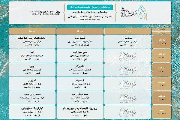 این اجراها هر روز از ساعت ۱۵ تا ۱۷ طبق جدول زمانبندی شده و تا اختتامیه جشنواره، بیستم دی ادامه خواهد داشت. نمایشهای «سردار نامی»، «شعر به توان زیاد»، «تنهای تنها»، «این مکان مجهز به دوربین مدار بسته است»، «لالایی برای فرزندان ننه ایران»، «فلاش بک» و «تیرنامه» در زمانهای مشخص شده اجرا میروند.