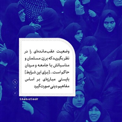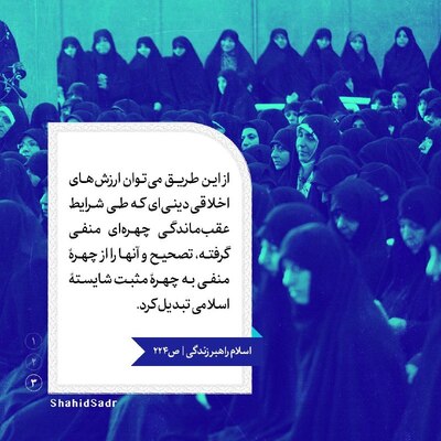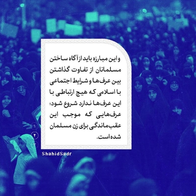 وضعیت عقب ماندهای را که بر زن مسلمان و مناسباتش با جامعه و مردان ، حاکم است در نظر بگیرید : بهجای اینکه بر اساس مفاهیم بیحجابی و دیدگاه تمدن غربی در مورد رابطه مرد و زن (که بخش عظیمی از افراد امت اسلامی را در صف مخالفان این دیدگاه قرار میدهد) به نبرد با این عقب ماندگی پرداخته شود، بایستی مبارزهای براساس مفاهیم دینی صورت گیرد و این مبارزه باید از آگاه ساختن مسلمانان از تفاوت گذاشتن بین عرفها و شرایط اجتماعیای که موجب این عقب ماندگی برای زن مسلمان شده است و بین اسلامی که هیچ ارتباطی با این عرفها ندارد ، شروع شود . از این طریق میتوان ارزشهای اخلاقی دینی که طی شرایط عقب ماندگی چهرهای منفی گرفته، تصحیح و آنها را از چهره منفی به چهره مثبت شایسته اسلامی تبدیل کرد. [شهید محمدباقر صدر؛ کتاب اسلام راهبر زندگی، صفحه ۲۲۴]