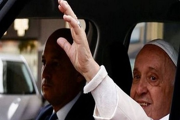 رهبر آرژانتینی کاتولیکهای جهان حین خروج از بیمارستان با یک خودروی سفید رنگ برای خبرنگاران حاضر در نزدیکی بیمارستان دست تکان داد و به شوخی به آنها گفت: «من نترسیده بودم، من هنوز زنده هستم».