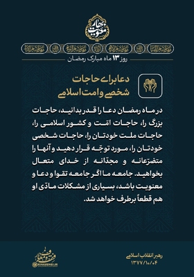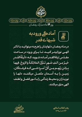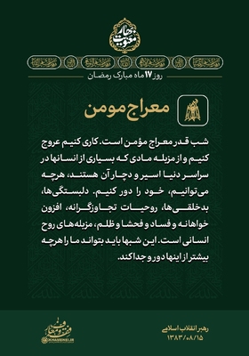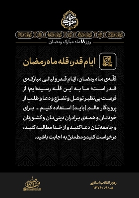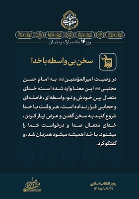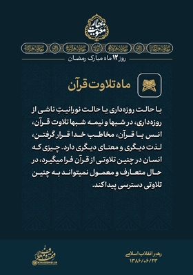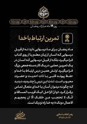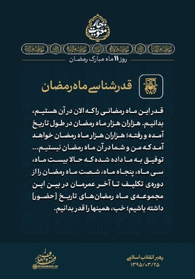 با حالت روزهداری یا حالت نورانیتِ ناشی از روزهداری، در شبها و نیمه شبها تلاوت قرآن، انس با قرآن، مخاطب خدا قرار گرفتن، لذت دیگری و معنای دیگری دارد. [رهبر معظم انقلاب] مجموعهای از بیانات حضرت آیتالله خامنهای درباره ماه مبارک رمضان برای استفاده بیشتر از فرصت ارزنده و معنوی این ماه، در قالب مجموعه سخننگاشت «بهار معنویت» در چهار بخش منتشر ارائه میشود. در ادامه قسمت چهارم این مجموعه را مشاهده میکنید.