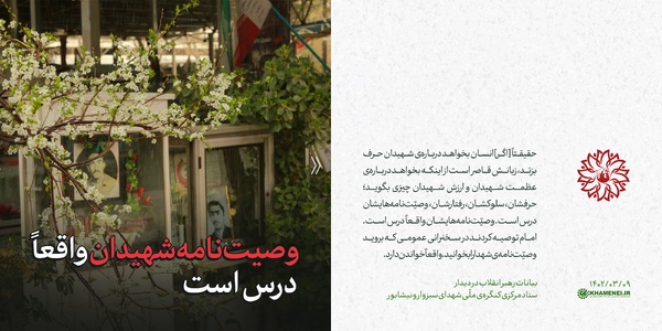 رهبر معظم انقلاب در کنگره ملی بزرگداشت شهدای سبزوار و نیشابور فرمودند «اگر انسان بخواهد درباره شهیدان حرف بزند، زبانش قاصر است از اینکه بخواهد درباره عظمت شهیدان و ارزش شهیدان چیزی بگوید؛ حرفشان، سلوکشان، رفتارشان، وصیتنامههایشان درس است». در ادامه بخشی از بیانات رهبر انقلاب اسلامی در دیدار دستاندرکاران برگزاری کنگره ملی بزرگداشت دو هزار و چهل و چهار شهید سبزوار و همچنین دست اندرکاران کنگره ملی دو هزار و چهارصد و نود و هشت شهید نیشابور و جمعی از خانوادههای شهدای این دو شهر، در قالب سخننگاشت ارائه میشود.
