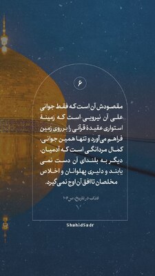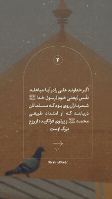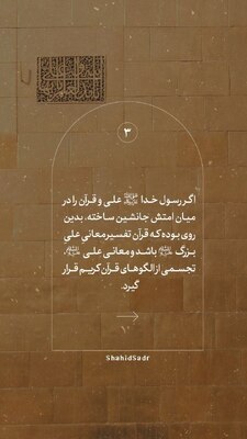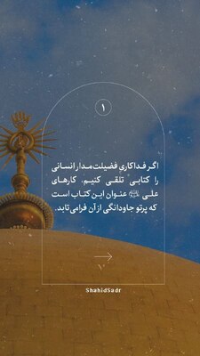 اگر فداکاری فضیلتمدار انسانی را کتابی تلقی کنیم، کارهای علی(ع) عنوان این کتاب است که پرتو جاودانگی از آن فرا میتابد. اگر اصول آسمانی محمد(ص) نمودی عملی بر روی زمین داشته باشد، علی(ع) تجسم زنده آن اصول در طول همه روزگاران و همه نسلهاست. اگر رسول خدا(ص) علی و قرآن را در میان امتش جانشین ساخته، بدین روی بوده که قرآن تفسیر معانی علی بزرگ(ع) تجسمی از الگوهای قرآن کریم قرار گیرد. اگر خداوند علی(ع) را در آیه مباهله، نفْس [یعنی خود] رسول خدا (ص) شمرد، از آن روی بود که مسلمانان دریابند که او امتداد طبیعی محمد(ص) و پرتوی فراتابیده از روح بزرگ اوست. [شهید علامه محمدباقر صدر، کتاب فدک در تاریخ، صفحه ۱۰۶]