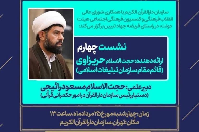 این نشست چهارشنبه، ۲۵ مردادماه از ساعت ۱۳ در سالن جلسات سازمان دارالقرآن الکریم برگزار خواهد شد.