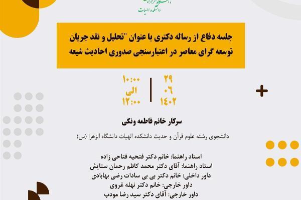 به گزارش ایکنا، به نقل از دانشگاه الزهرا(س) رساله «تحلیل و نقد جریان توسعه گرای معاصر در اعتبارسنجی صدوری احادیث شیعه» توسط فاطمه ونکی، دانشجوی رشته علوم قرآن و حدیث دانشکده الهیات دانشگاه الزهرا(س) و با راهنمایی فتحیه فتاحیزاده و محمدکاظم رحمان ستایش نگاشته شده است.
