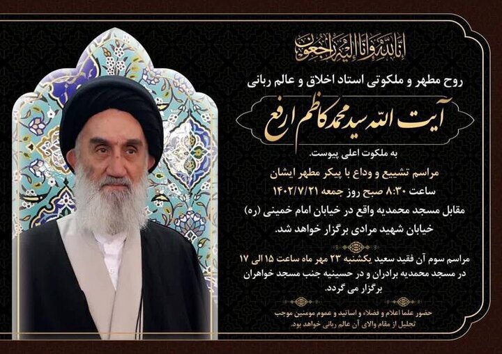 مراسم تشییع پیکر آیتالله سیدمحمدکاظم ارفع فردا جمعه ۲۱ مهرماه از مسجد محمدیه واقع در خیابان امام خمینی (ره)، خیابان شهید مرادی برگزار خواهد شد.