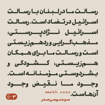 اسرائیل نماد کامل انحصارطلبی، تفرقهافکنی نژادپرستانه و تعصبهای دینی است. خداوند میخواهد تفاوت شریعتها و فرقهها راهی برای تولید انگیزه و واداشتن انسانها به تولید و سازندگی شود. این تعریف تنوع فرقههاست؛ اما اینکه دین به تعصب و کینهتوزی رضایت داده باشد، نادرست است. وجود فرقهها و مذاهب گوناگون در لبنان خیر مطلق است ولی نظام مذهبگرا برای لبنان شر مطلق است. رسالت ما در لبنان با رسالت اسرائیل در تضاد است. رسالت اسرائیل نژادپرستی، مذهبگرایی و رد همزیستی است و رسالت ما برای همگان همزیستی، گشودگی و بشردوستی مؤمنانه است. وجود ما نقیض وجود آنهاست. [امام موسی صدر]